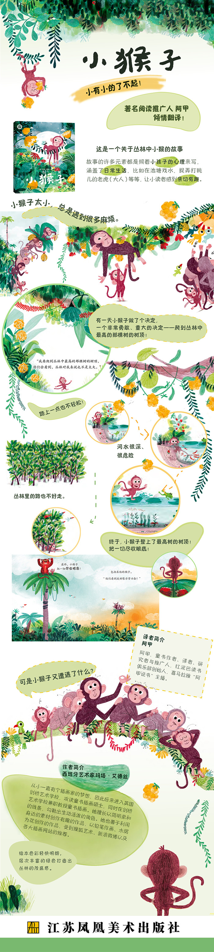 这是一个关于丛林中小猴的故事,许多元素都是照着小孩子的心理来写,涵盖了日常生活,比如在池塘戏水,捉弄打盹儿的老虎(大人)等等,让小读者感到亲切有趣。绘本色彩轻快明朗,层次丰富的绿色打造出丛林的茂盛感。在丛林中玩耍的猴子们造型机灵可爱,圆圆的脑袋,丰富的表情,长长的尾巴。小猴子很精确地捕捉到孩子的调皮劲儿和精气神儿,让读者忍不住想要去了解发生在小猴子身上的故事。同时,作者还在图画中藏着许多小细节,值得小读者一遍一遍地重读。