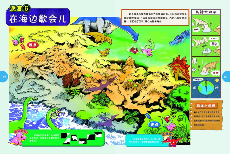 这里有恐龙迷宫、恐龙小漫画、恐龙趣味找找看、恐龙小常识、恐龙机智问答……还有恐龙迷你图鉴!