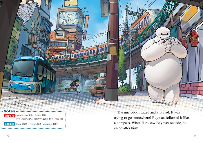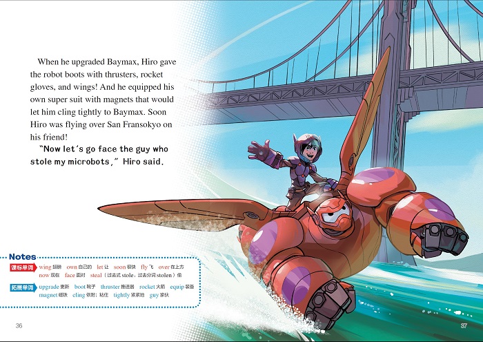 这是一本少儿英语书。故事内容为迪士尼动画片《超能陆战队》的英文故事。故事讲述了天才少年小宏的哥哥因为救人献出了自己的生命,小宏因此一蹶不振。在充气机器人大白的帮助下,小宏发现有人要在暗中进行犯罪行为。为了保卫城市,小宏和大白一起,联手其他四个好朋友,组建了“超能陆战队”。他没想到,罪犯竟然与死去的哥哥有关……书中包含解释每页生词的Notes、区分课标词和拓展词的单词表、和每页对应的中文译文,并附有线上“常速版”“跟读版”音频,帮助孩子实现无障碍英语阅读,提升阅读能力。