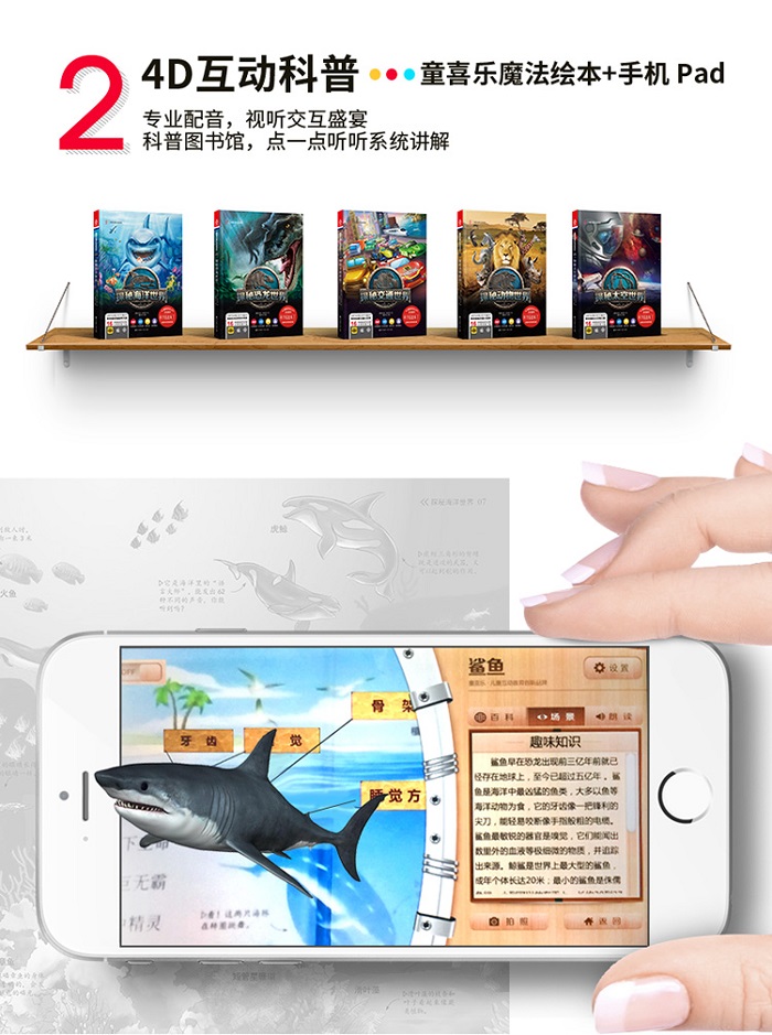 《童喜乐魔幻互动百科》是结合增强现实技术的科普宝典。百科共计十册涵盖丰富完整的知识与精采绝伦的图画,加上翻页效果,读起来更有趣,再透过先进的AR技术,让重点图画呈现360度4D动感, 造成神奇的动画效果引发更多的惊奇与好奇,让学习百科知识变得更立体,更多元,学习效果更好奠定儿童厚实的百科涵养。