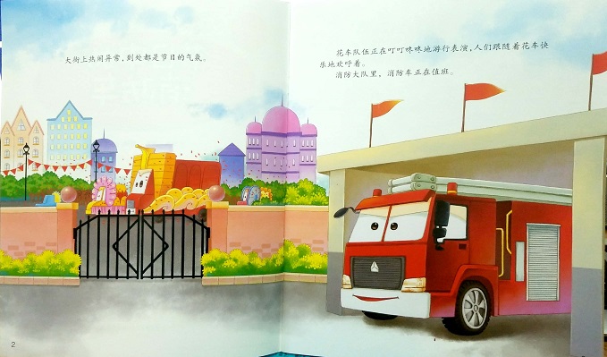 《节日中的消防车》讲述:在所有人都放假的节日里,消防车却孤零零地在消防大队里值班,任由巴士花车怎样劝他出去玩,他都坚定地不肯离开岗位半步。