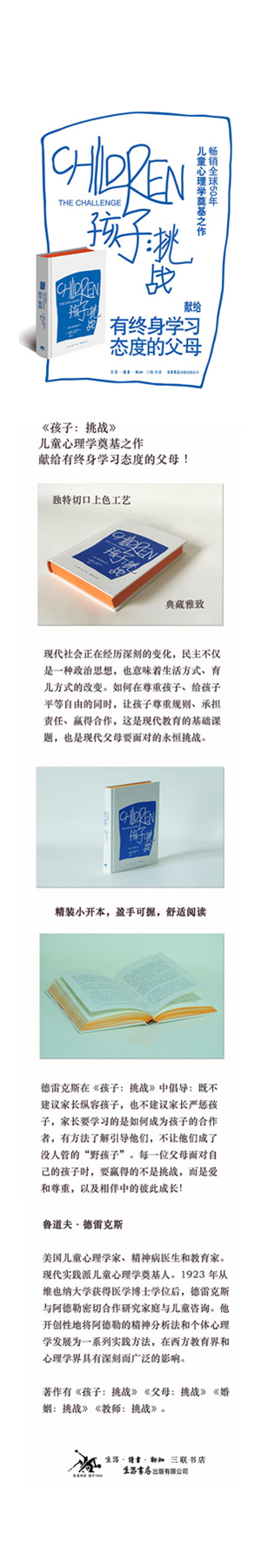 从“独裁的阶级社会”到“人人平等的民主社会”,现代社会正在经历深刻的变化,民主不仅是一种政治思想,也意味着生活方式、育儿方式的改变。如何在尊重孩子、给孩子平等自由的同时,让孩子尊重规则、承担责任、赢得合作,这是现代教育的基础课题,也是现代父母要面对的永恒挑战。——这段赫然印在题词页的话,正是德雷克斯创作《孩子:挑战》这部家庭教育代表作的核心理念。