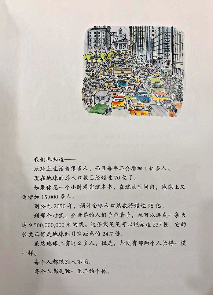 地球上生活着很多人,而且每年还会增加好几千万人。现在地球的总人口数已经超过65亿了。那个时候,全世界的人们手牵着手,就可以练成一条长达9185469365米的线。这条线足足可以绕迟到229圈,它的长度正好是地球到月球距离的24倍。虽然地球上有这么多人……,但是,却没有哪两个人长得一模一样。每个人都跟别人不同。