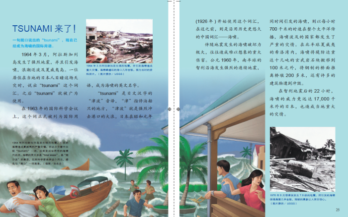 1964年3月,阿拉斯加列岛发生了强烈地震,并且引发海啸,浪潮还波及夏威夷岛。一位居住在当地的日本人目睹这场天灾时,说出"tsunami"这个词汇。之后"tsunami"就被广为使用。