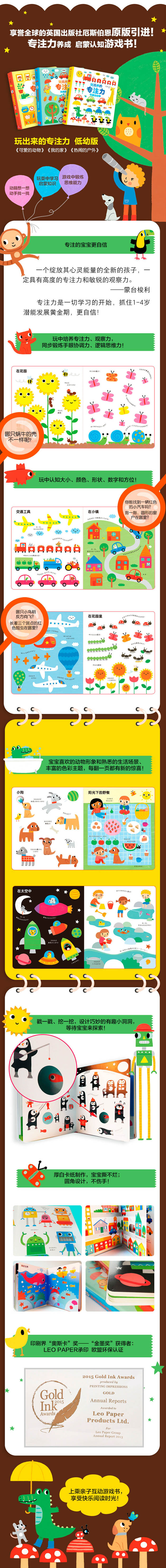 这是一套适合2-4岁小朋友阅读的专注力养成认知书,使孩子在边玩边学中培养专注力,并学习物体、颜色、形状、数字等概念,共三本。全球著名儿童USborne出版社出品。本书以户外主题,在每页设计亲子互动题目,让小朋友们去找不同、找相同、找数量、找颜色等,在寻找的过程中认识动物、颜色和形状等知识。是一本很好的亲子互动图书,同时培养孩子的观察能力和专注能力。