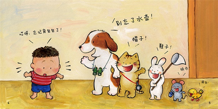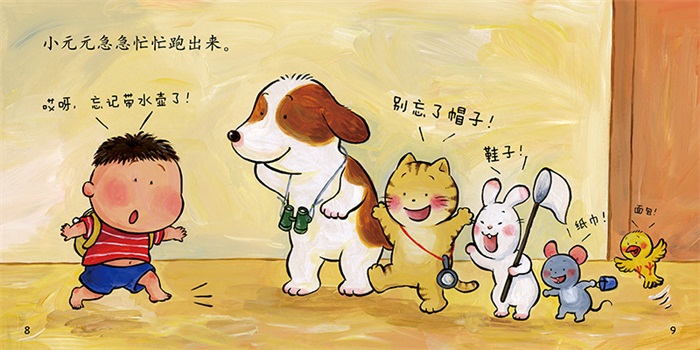 •故事简单有趣,通过小动物们提醒小元元带物品的过程,提升宝宝的生活自理能力,为宝宝入园做好准备