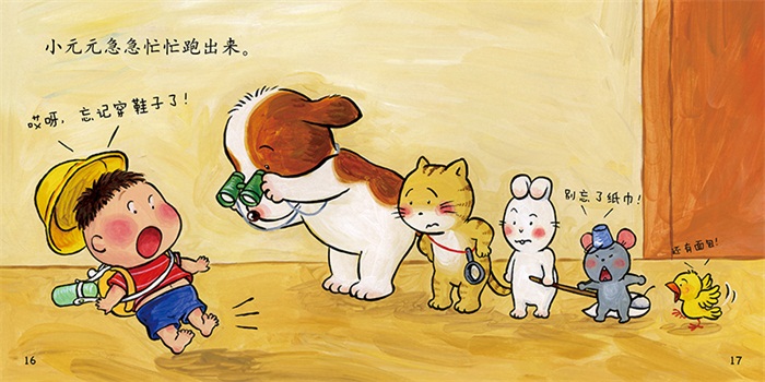 小元元要和小伙伴们一起出去玩,可他总是忘记带东西,一会儿忘记带包包,一会儿忘记带水壶,一会儿忘记戴帽子,一会儿忘记穿鞋子……故事通过小伙伴们和小元元之间的趣味互动,让宝宝能够了解出门游玩需要带什么物品,从而提升宝宝的生活自理能力,培养宝宝的独立性。