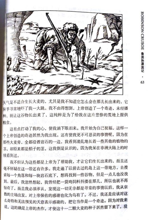 我不由得想到,上帝创造了一个奇迹,未经播种,就让这谷物长出来了,这纯粹是为了给我在这片悲惨的荒地上提供粮食。(P63)