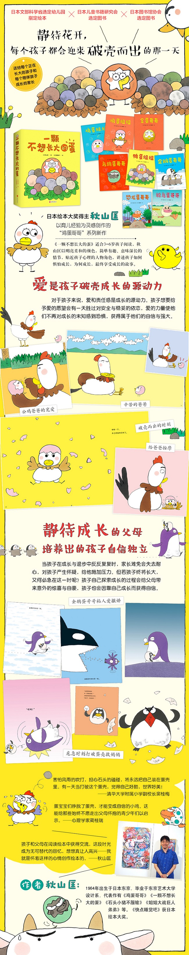《一颗不想长大的蛋》(全8册)是日本大奖绘本作家秋山匡的代表作,是日本文部科学省选定幼儿园指定绘本、日本图书馆协会选定图书、日本儿童书籍研究会选定图书,并获得清华大学附属小学副校长窦桂梅、心理学家蔺桂瑞、儿童文学家梅子涵和原深圳后海小学校长袁晓峰一致推荐。谨将这套绘本送给每个正在长大的孩子和和每个陪伴孩子成长的家长:静待花开,每个孩子都会迎来“破壳而出”的那一天。