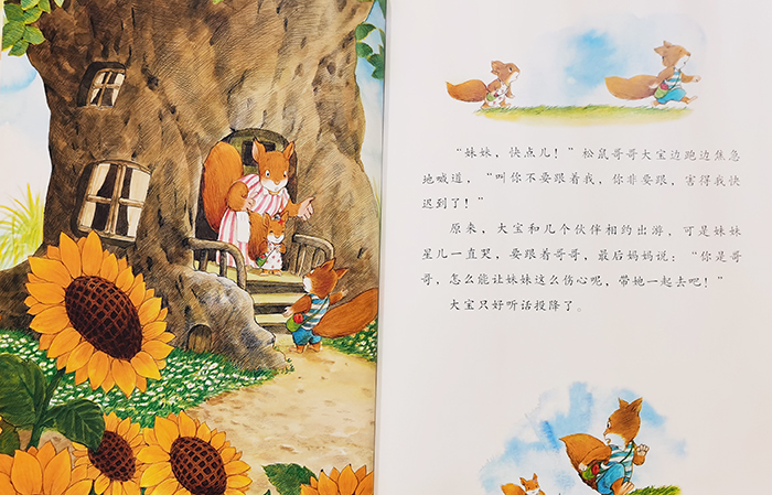 《好哥哥好妹妹》 松鼠和朋友相约出游,妹妹要跟着去,她年纪小、动作慢,碍手碍脚的,大宝实在不想带着她,可是,妈妈还是让大宝带她一起去……哥哥到达约会地点,就将妹妹一个人留下来,他和朋友在河那边玩得很开心。忽然天色变暗,下起暴雨,朋友们各自离去,哥哥大宝急忙往回跑……大宝赶回来四处都没有找到妹妹,绝望之时,终于在避雨的树洞中找到了妹妹,兄妹俩拥抱在一起。他们分吃苹果后,便手拉着手快乐地回家了
