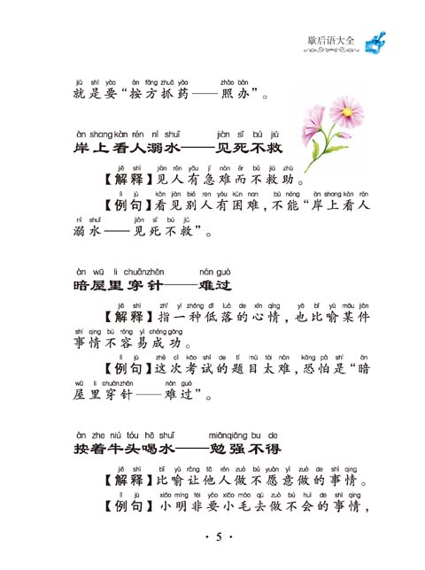 歇后语,中华民族广泛流传的一种语言文化,汉语中一朵璀璨无比的奇葩。虽然每句仅寥寥数字,但却能清楚地说明一个问题或道理,是我国劳动人民的智慧结晶。走进《歇后语大全》,让你在学习文化知识的同时,领略我国的民族特色与浓郁的生活气息。