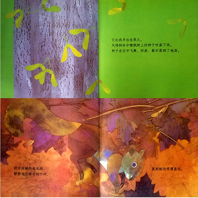 《红叶黄叶》一个孩子与一棵糖枫之间的故事。在城市化大发展的时代,这份亲子共同探索自然的愉悦体验弥足珍贵。作者用实际的种子,布料,线,根配合水彩拼贴画,创作了一部充满奇思妙想的绘本,为读者提供了一场视觉盛宴。作者还在附录里进一步展示了关于生物学和树木保养的细节。