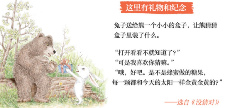 《熊和兔》是一套中国原创图画书,是一系列适合3~8岁儿童的友谊主题图画故事。熊和兔子,一个憨厚朴实,一个机灵古怪。他们是那么地不同,但却是最好的朋友。因为,真正的友谊不会被性格差异所阻碍,理解、包容、体贴和爱,才是友谊的厚重基石。《够不着》是其中一本,讲述的是熊和兔子一起去放风筝,兔子随着风筝飘到了半空中,熊怎么也够不着,这可把熊给急坏了。为了救兔子,熊想出了各种各样的办法……有时候,友谊就像一堆温暖的篝火,给人帮助、安慰。