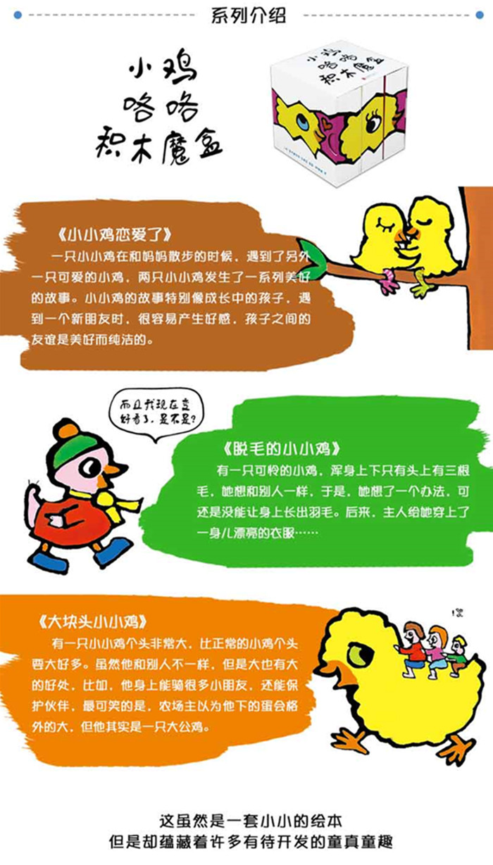 脱毛的小小鸡 有一只可怜的小鸡,浑身上下只有头上有三根毛,她和别人不一样,她想和别人一样,于是,她想了一个办法,可还是没能让身上长出羽毛。后来,主任给她穿上了一身儿漂亮的衣服,她的生活变得美好起来。