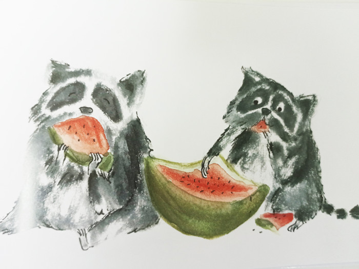 3.水墨风格的插图,童趣盎然。寥寥几笔便勾勒出了形态各异的可爱浣熊,表情惟妙惟肖。水墨风格的插图与白色背景形成强烈的视觉反差,使角色的形象更加鲜明。简简单单,一目了然。