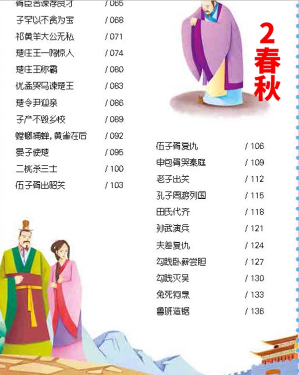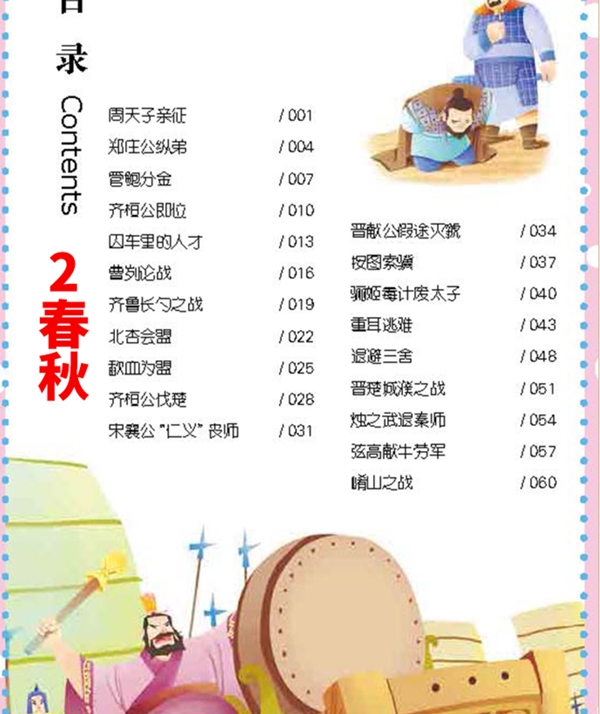 《中华上下五千年·春秋》:本书以历史时间为线索,以长勺之战、齐桓公伐楚、晋献公灭虢、城濮之战、崤山之战等历史事件为中心,以郑庄公、齐桓公、楚庄王、宋襄公、子产、晏子、伍子胥、老子、孔子、夫差、勾践、鲁班等历史人物为焦点,以小故事的形式讲述了这段历史时间内的历史事件、人物故事。全书图画明快活泼,大字拼音,有声朗诵,适合儿童阅读需求,是向少年儿童传播传统历史文化的极佳读物。
