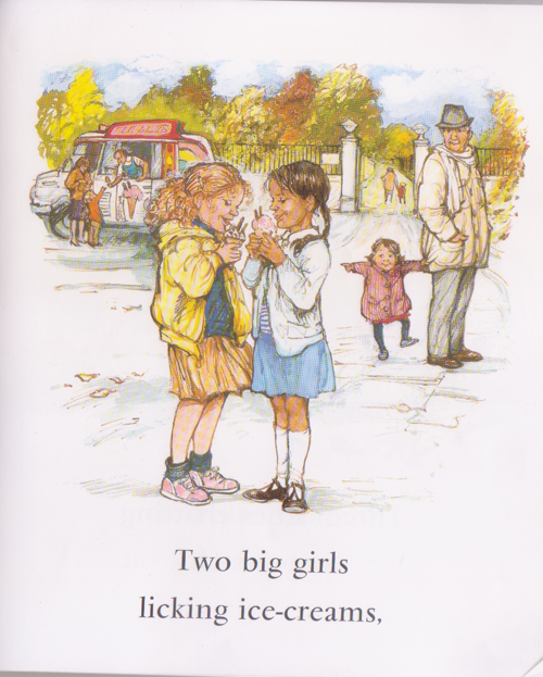 One black cat sitting on a wall, two big girls licking ice-creams, three ladies chatting on a bench...