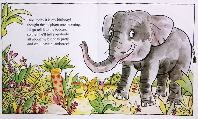 这一天是大象的生日,他要热热闹闹地举行生日舞会来庆祝,所以想请句嘴鸟通知树林中所有的朋友们一同前来参加,请老虎将消息告诉巨嘴鸟去通知,不过老虎也找不到巨嘴鸟。于是老虎告诉疣猪,而疣猪告诉河马,真不巧,河马也找不到巨嘴鸟,所以他告诉狮子,狮子便告诉牛蛙,牛蛙则告诉斑马...最后猴子找到巨嘴鸟,当巨嘴鸟去通知大象生日舞会的时候,却一个动物也找不到。巨嘴鸟失望极了!当他去大象那里时,大象却先开口谢谢他帮自己传达舞会的消息,原来全部聚集到大象家里庆祝了!