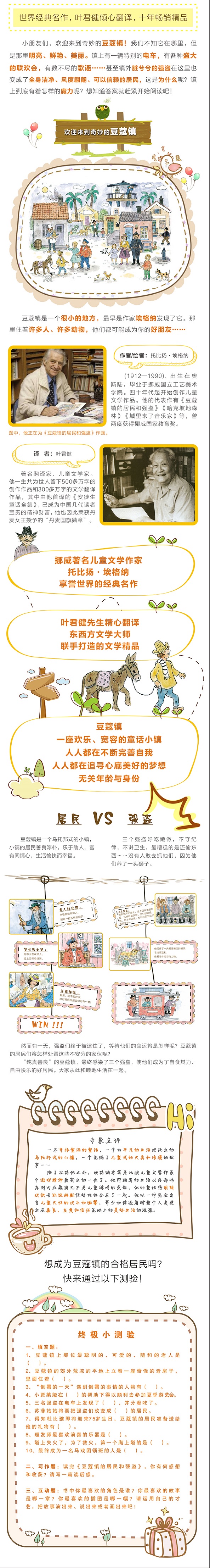 ★在豆蔻镇上发生的一切,与其说是一个精心编织的故事,还不如说是一场随心所欲的游戏。在这个游戏里面,每一个孩子都能够找到属于自己的角色,他们自己扮演着自己,并在这扮演的过程中发现了爱人和被人爱的乐趣一 ——漪然 ★无论如何,豆蔻镇是个奇妙的小镇。那里是孩子眼中的人间世界,成人眼中的乌托邦。那里是天堂,是永无岛,是世外桃源,是一个时间不再流动的美丽世界。我们从未拥有,却一直想要寻回。 ——网友 ★感谢托比扬·埃格纳,给了我一个纯真而快乐的童年,让我留下了许多美好的回忆。长大成人的我们,已经很难再找到那种简单的快乐。 ——网友 显示部分信息