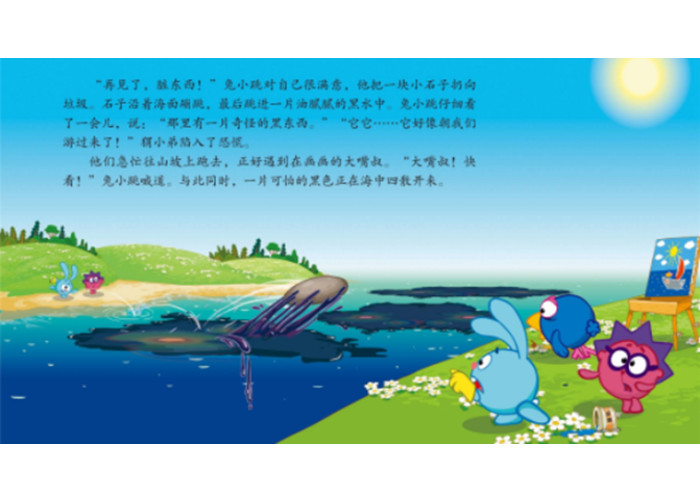 一天,兔小跳和猬小弟在打扫海滩的卫生,把垃圾全部装上小船漂向远方,只要垃圾离他们越远越好。突然,他们发现了海面上有奇怪的黑色污渍,正无情地漂向岸边。经证实居然是工业废油。为了保护这片美丽的海,开心球们齐心协力,清楚了海上的污渍,把自己的垃圾也收拾起来。