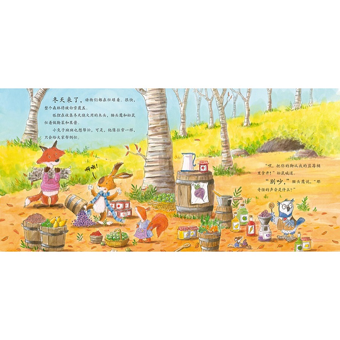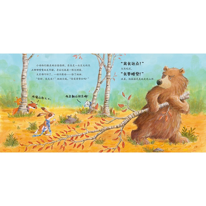 寒冷的冬天就要来了,可怜的大熊却怎么也睡不着。“听起来那头熊好像很生气,”动物们说,“要是他来抓我们可怎么办呀?”他翻着身、打着滚,呼噜呼噜地抱怨着。小兔子斑斑不怕大熊,而且,他很快就想到了一个绝妙的主意……一个关于理解和帮助的暖心故事。