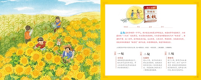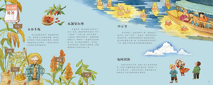 二十四节气是中华民族悠久历史文化的重要组成部分,凝聚着中华文明的历史文化精华。在国际气象界,被誉为“中国的第五大发明”。 2016年11月30日,二十四节气被正式列入联合国教科文组织 人类非物质文化遗产代表作名录。 本书按照春、夏、秋、冬一年四季二十四节气的时间顺序,详细地为孩子科普了二十四节气的相关知识。每本书都有一个小主人公,孩子们可以和她们一起跟着二十四节气展开各种各样的旅行。书中不仅有二十四节气的相关知识,还介绍了传统节日、传统饮食、传统习俗等相关内容。回归传统,让孩子对中华民族的优秀传统文化有更加深刻的体会。另外,书中的知识补给站内容也非常丰富,诗歌欣赏、创意手工、趣味游戏等,给孩子一个不一样的文化体验。 《跟着二十四节气去旅行·秋》 在秋天里,秋秋和家人一起,在立秋看片梧桐叶落,处暑享受五谷丰收的喜悦,白露有香味飘飘的桂花、吐鲁番香甜可口的葡萄,中秋吃月饼赏月,寒露赏菊看落叶纷飞,霜降有纷纷成熟的柿子橘子……