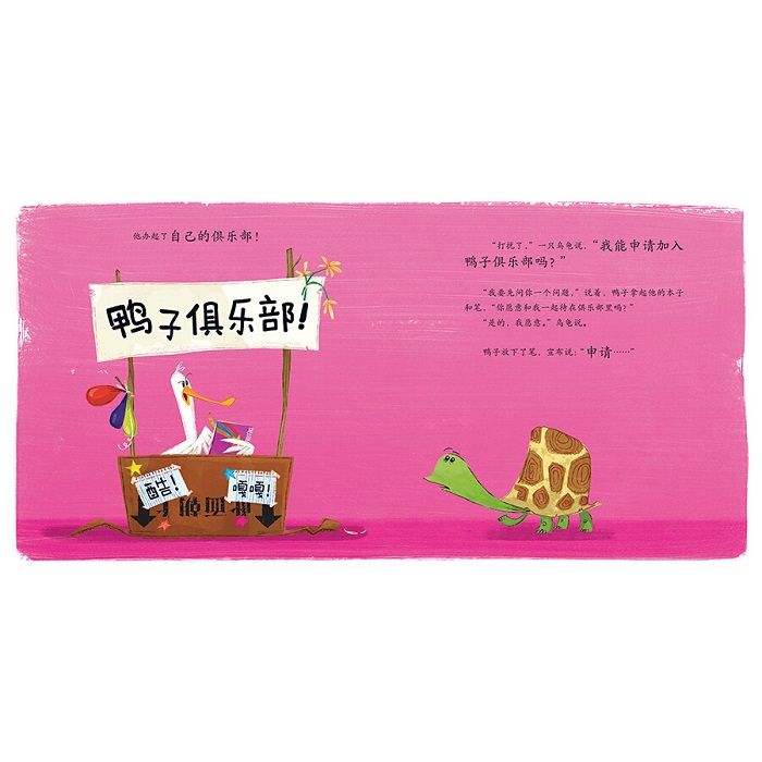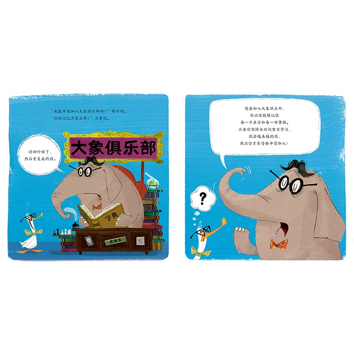 鸭子想要交朋友,所以他申请加入各种俱乐部。可他既不能像狮子一样咆哮,也不能像大象一样吼叫,更没有大象的好记性……于是这些俱乐部都驳回了他的入会申请。他该怎么办呢?没关系,鸭子已经想到一个好主意啦!