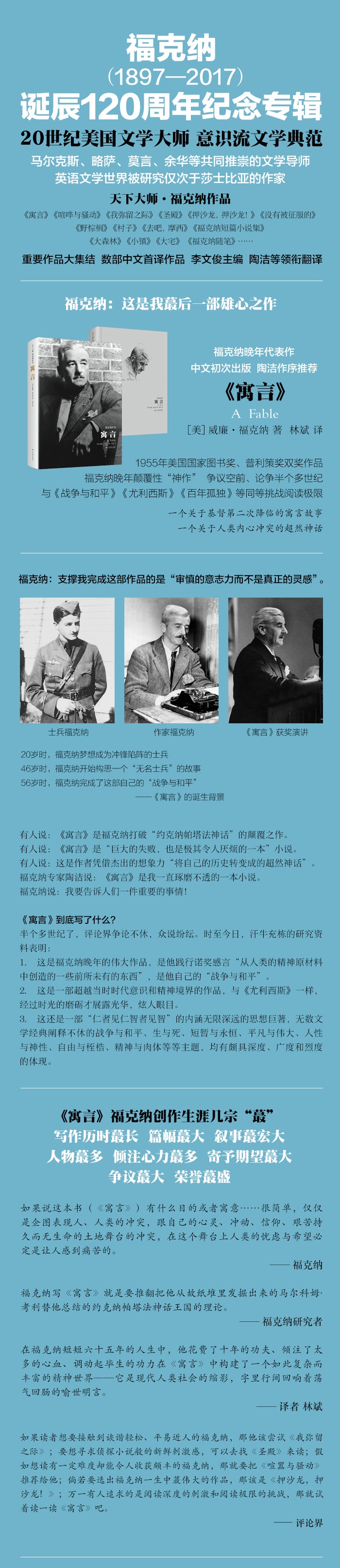 2. 福克纳是一个非常有意思、非常多面,甚至难以简单概括的作家。他的人生中的种种小节、细节,在他的小说中体现得有限,而在他的散文、随笔、书信、公开演讲词中展露无遗,甚至更具戏剧性。