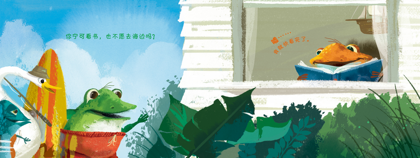 青蛙兄弟对于如何度过在海边的一天有完全不同的想法,弟弟想去冲浪,哥哥则沉浸在书中。但就在哥哥一边看《白鲸》一边惊叹连连的过程中,弟弟也不禁被故事吸引了进去。在他们到达海边、欢呼着“冲浪去”之前,这两只小青蛙已经共同在书中经历了一次捕鲸的冒险。青蛙弟弟惊奇地发现,原来阅读带来的乐趣一点也不亚于海上冲浪!