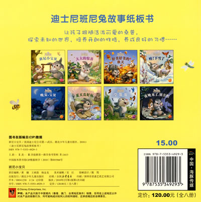 迪士尼班尼兔故事纸板书一共有八册。包括:《班尼小宝贝》《大大的惊喜》《好美好美的秋天》《哇!下雪了》《夜晚来了,别害怕》《学数数》《夏天真好玩》《晚安,宝贝》