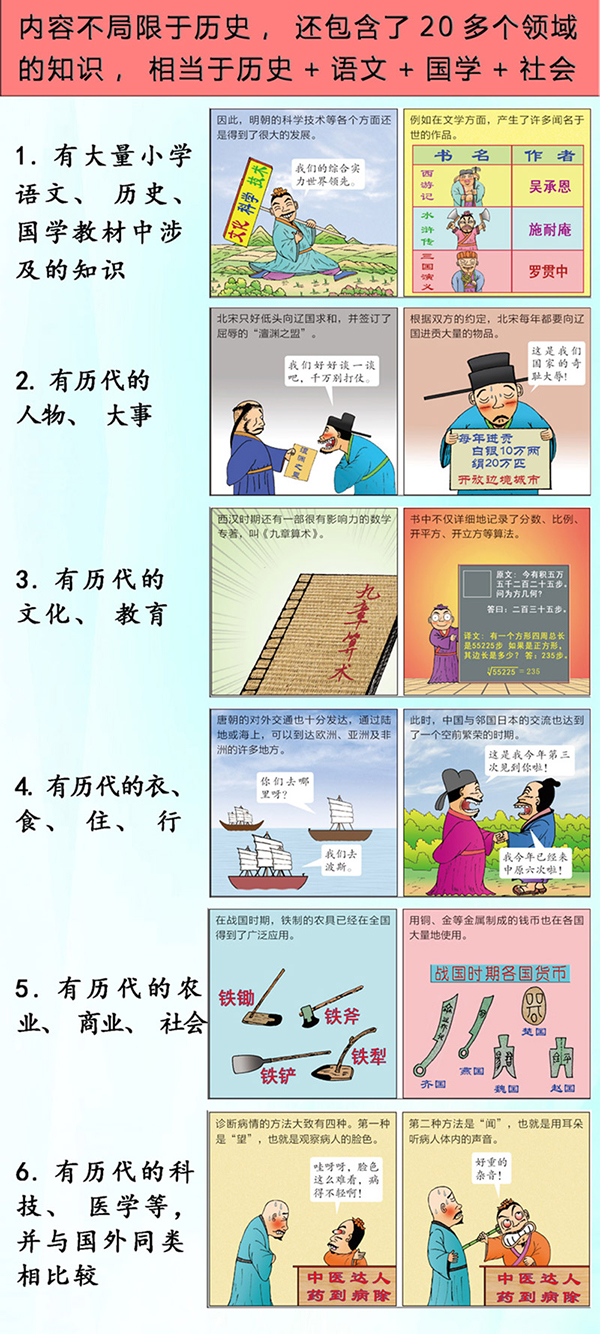 这是一套画出来的百科全书,系统介绍各个朝代的名人、大事、科学、文化、民俗、典故 。 这是一套简明生动的历史漫画,语言通俗,画风幽默,轻轻松松让你成为历史达人。 这是一套可以亲自互动的图书,历史常识拓宽眼界,趣味谜题传递快乐,一起考考身边人