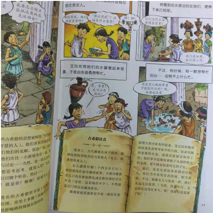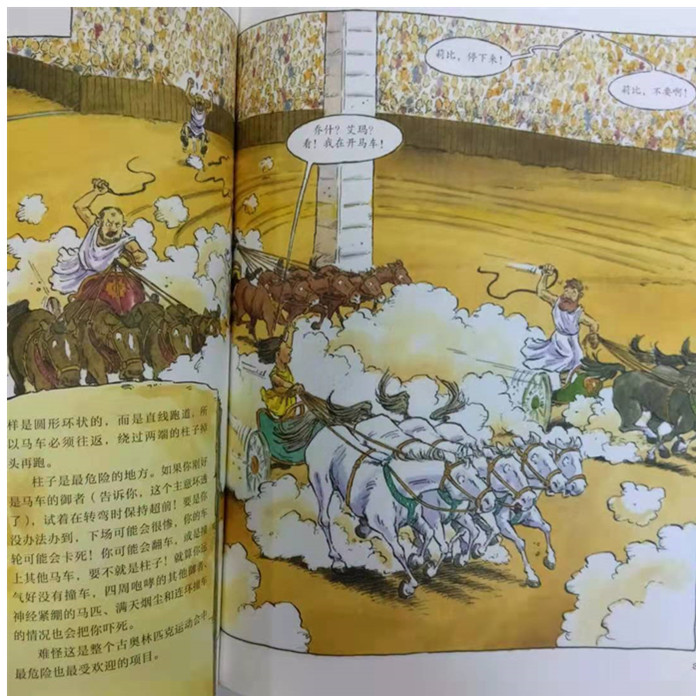 这套“神奇时光探险之旅”看漫画学历史的书,正是小朋友学习历史的敲门砖。在书中,宾克顿家的三个孩子误闯神奇时光旅行社,翻阅旅行社老板佩蒂格鲁的独家旅游指南,进行时光旅行,在惊险有趣的冒险中畅游了中世纪、古埃及、古希腊、古代中国、维京时代和冰河世纪。有趣的是,故事的铺陈很有技巧地将历史隐藏其中,对于觉得学习历史太沉重的孩子来说,完全不着历史痕迹。我建议,孩子们在看这一系列童书时,和书中一派轻松的故事情节叙述一样轻松阅读,跟着宾克顿家的孩子们去冒险,去看古埃及人的生活,尝尝汉朝时的面条,参加古代奥林匹克运动会,或是经历一场冰河世纪的探险。