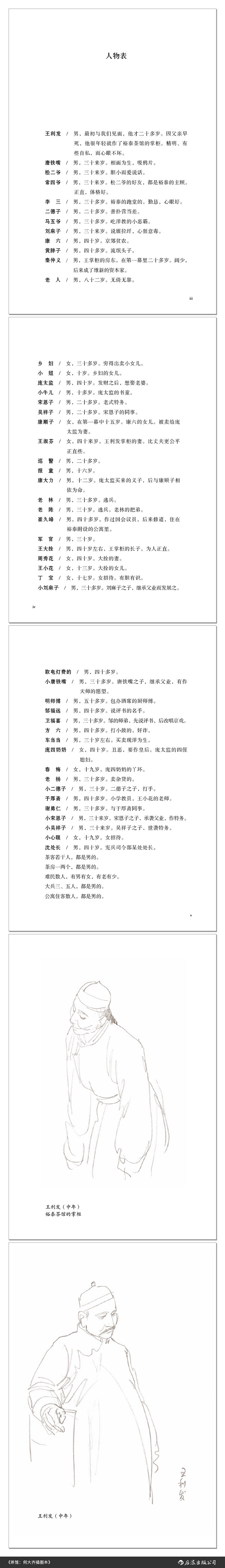 何大齐先生运用国画传统技法,通过插图形式让老舍先生笔下的经典角色跃然纸上,重现了二十世纪初老北京的风貌,帮助读者更直观地掌握小说精神与人物形象。三幕话剧《茶馆》是中国话剧史上的经典,剧中故事全部发生在一个茶馆里,六七十个人物先后登场,三幕剧分别展现了清末戊戌失败后、民国初年北洋军阀割据时期和国民党政权覆灭前夕三个时代的生活场景,概括了中国社会各阶层的尖锐对立和冲突,揭示了半封建半殖民地中国的历史命运。剧中人物台词既生动传神、富于个性,同时又简洁凝练,意蕴深长,至今仍是现代剧院的常备剧目。