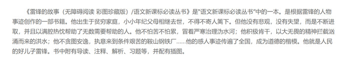 《雷锋的故事(无障碍阅读 彩图珍藏版)/语文新课标必读丛书》是“语文新课标必读丛书”中的一本。是根据雷锋的人物事迹创作的一部书籍。他出生于贫穷家庭,小小年纪父母相继去世,不得不寄人篱下。但他没有悲观,没有失望,而是不断进取,并且以满腔热忱帮助了无数需要帮助的人。他不怕苦不怕累,冒着严寒治理沩水河;他积极肯干,以大无畏的精神拦截汹涌而来的洪水;他不贪图安逸,执意来到条件艰苦的鞍山钢铁厂……他的感人事迹传遍了全国,成为道德的楷模。他就是人民的好儿子雷锋。书中附有导读、注释、解析、习题等,并配有插图。
