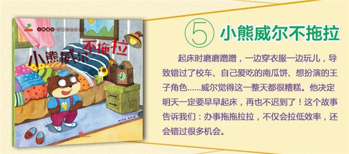 小熊威尔不拖拉起床时磨磨蹭蹭,一边穿衣服一边玩儿,导致错过了校车、自己爱吃的南瓜饼、想扮演的王子角色……威尔觉得这一整天都很糟糕。他决定明天一定要早早起床,再也不迟到了!这个故事告诉我们:办事拖拖拉拉,不仅会拉低效率,还会错过很多机会。