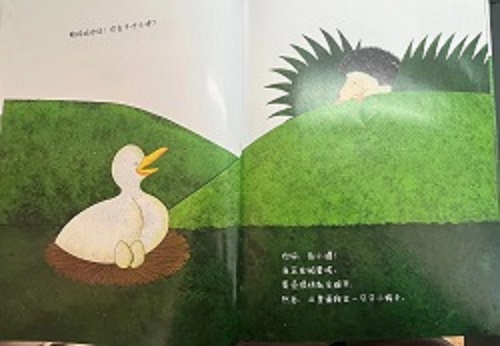 鸭妈妈你好!你在干什么呀?你好,小刺猬!我正在孵蛋呢。蛋壳很快就会破开,然后,从里面爬出一只只小鸭子。我也要去找一个蛋。