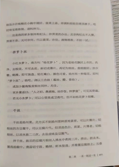 小红水萝卜,南方叫“杨花萝”,因为是杨花飘时上市的。洗净,去根须,不可去皮。斜切成薄片,再切为细丝,愈细愈好。加少糖,略腌,即可装盘,轻红嫩白,颜色可爱。扬州有一种菊花,即叫“萝卜丝”。临吃,浇以三合油(酱油、醋、香油)。