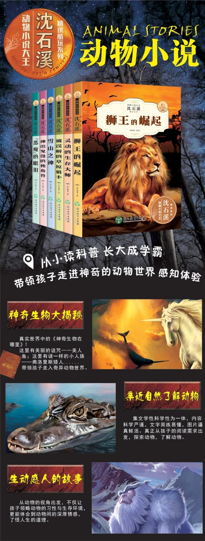 本系列是动物小说大王沈石溪等作家联合著作,共12种。每种包含约30个短篇动物故事,故事内容集文学性与科学性于一身,一方面通过文学的笔触向小读者讲述了各种各样的动物在自然界求生、觅食、繁衍、育雏等故事,另一方面又通过科普的形式将小学生应掌握的生物、环境、地理等知识融入其中,同时还潜移默化地将爱护动物、保护大自然的理念植入小读者的心田。 一阵低沉的野兽吼声撕破了正午的宁静,草丛中弹出了一个食肉动物的脑袋——这是一头美洲拟狮。美洲拟狮懂得合作捕猎的各种策略,野牛、页码、叉角羚甚至稍小的猛犸,都无法逃脱美洲拟狮的合力围捕......