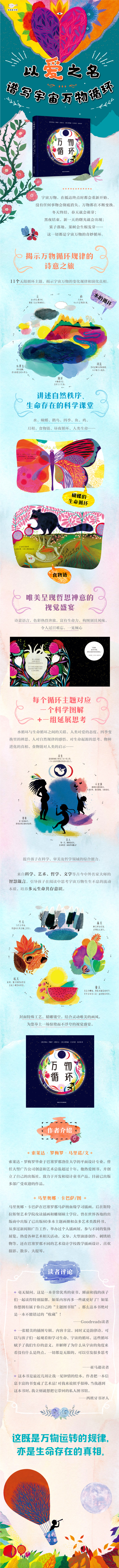 本书引进于西班牙。世界上,没有任何事物会彻底消失,万物都处在不断的变换之中。冬天沉寂,春天就会萌芽;黑夜结束,新一天的曙光就会出现;果实落地,一棵新的果树就会生根发芽……《万物循环》是一本富有诗意的科普图画书。全书用唯美的画面和隽永的诗句呈现了宇宙万物中十一个奇妙的自然周期:水的循环、蝴蝶蜕变、候鸟迁徙、季节变换、鹳鸟的生命循环、月相循环、鱼的生命……讲述着宇宙和万物生命之间的神奇而永恒的循环,为读者开启了一场诗意的科学之旅。