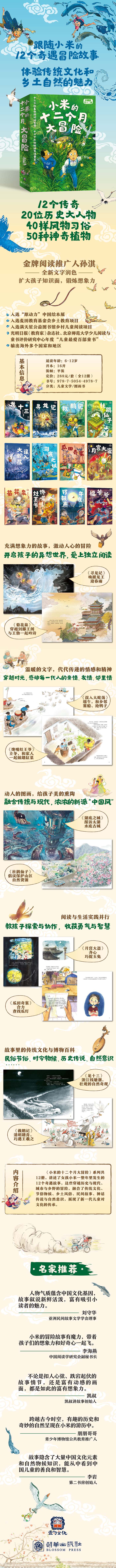 讲述了女孩小米一整年里发生的12个奇遇故事,这些穿越历史与现代、城市与乡野的冒险,融合了传统文化、节俗物候、乡土风俗、民间故事、神话传说与自然意识,展现了新一代儿童对文化的传承。