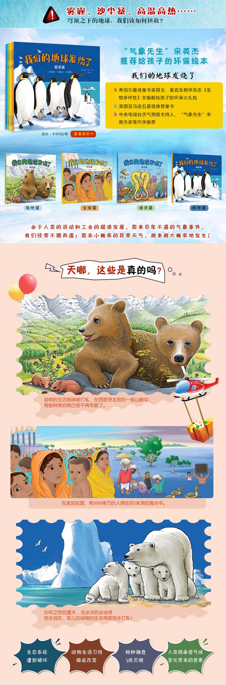 本套书共四册,分别是《极地篇》《海洋篇》《陆地篇》《全球篇》。从四个方面讲述了“温室效应”产生的原因以及负面影响。