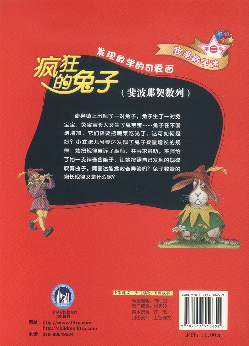 《疯狂的兔子》(知识点:斐波那契数列)奇异镇上出现了一对兔子,兔子生了一对兔宝宝,兔宝宝长大又生了兔宝宝……兔子在不断地增加,它们快要把蔬菜吃光了,这可如何是好?小女孩儿阿曼达发现了兔子数量增长的规律,她把规律告诉了巫师,并寻求帮助。巫师给了她一支神奇的笛子,让她按照自己发现的规律吹奏曲子。阿曼达能拯救奇异镇吗?兔子数量的增长规律又是什么呢?