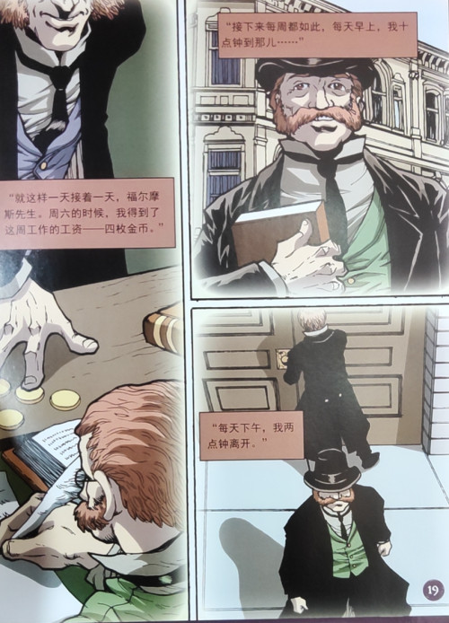 《福尔摩斯探案集 (漫画版) 第1辑》(全6册)。在这一辑中,大侦探福尔摩斯和华生去到了农庄、空房子……从一份红发俱乐部的广告开始最后破获一个犯罪团伙的过程,破解了花斑带之谜。每一本都是一个独立的故事,以侦探福尔摩斯与华生的经历为主线,引出了一件件耸人听闻的奇案,他们联手解决了一些悬而未决的疑案。本册《红发会》,故事背景是:一头红发的威尔逊遇到了一件奇怪的事,他入选红发会,每天只需干很少的工作就能拿到很高的薪酬。红发会却毫无征兆解散了。于是他找到福尔摩斯,经过福尔摩斯的推理,认为这是一起偷盗金库的案件,最后他们与警方一起将犯人抓获。