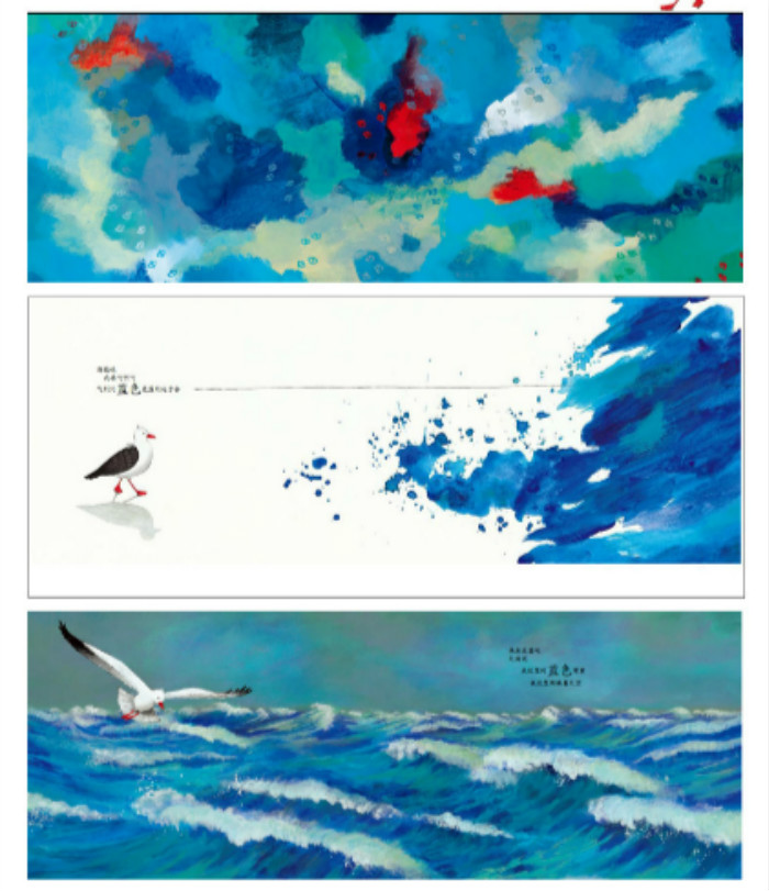 小海鸥一心想要飞到比蓝色更蓝的地方去,她想知道究竟谁拥有最深、最亮、最蓝的蓝色,到底是大海还是天空?于是她飞啊飞啊,不停地比较、不停地寻找。天空与海洋成了广阔的舞台,天空、白云、风浪、大海、沙滩,轮番出场,共同演奏这场华丽丽的色彩交响曲!