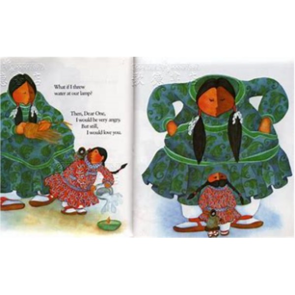 This exceptional board-book tells a beautiful and timeless story about a daughter's attempt to find the limit of her mother's love. Barbara Lavallee's exquisite illustrations of Alaska, with their exaggeratedly foreshortened perspective and rich tones of violet, blue-gray, and gray-green, tell of an easy declaration ("I love you more than the raven loves his treasure, more than the dog loves his tail, more than the whale loves his spout") that is pushed, and pushed, and ("What if I put salmon in your parka ... and ermine in your mukluks?") pushed. There's a quiet joyfulness in both the antics of the Inuit mother and daughter and in the animals--including a polar bear and a musk ox--that the daughter imagines she might become. A charming story for mothers and daughters of all ages.