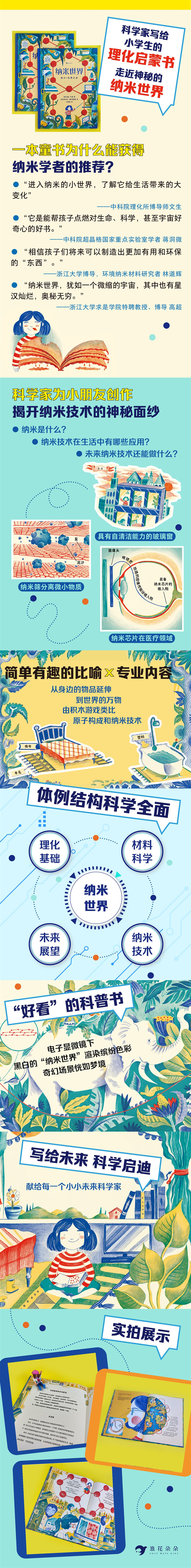 科学家写给小学生的理化启蒙书,获得多位纳米学者好评 这本书以纳米技术为主题,从世间万物的理化组成讲起,内容涉及原子、分子的概念;元素的含义;元素构成和材料性质的关系;如何用纳米技术制造新材料;纳米材料的应用;纳米技术的展望……知识点丰富,脉络清晰。 走近改变世界的纳米科技,点燃孩子探索科学奥秘的兴趣 纳米技术听起来神秘,实际上它已经走进了我们的日常生活。近年来,新的纳米材料让我们拥有了更好的手机屏幕,可以自清洁的玻璃窗,质量更轻、速度更快的飞机……在未来,纳米技术会有更多突破。也许看这本书的孩子在启发下也会投身科学研究呢! 清新奇幻的插画风格,简单有趣的类比,让读者能轻松进入纳米世界,饱览前沿科技 电子显微镜下的“纳米世界”是一片黑白,而插画家用丰富的想象力让我们看到了那个小小世界的色彩缤纷,用奇幻的超现实场景帮助我们理解纳米科技知识。另一方面,作者使用了大量有趣的类比,用生活的事物解释那些复杂的科学概念,大大降低了理解的难度。比如,作者把纳米技术比作积木游戏,解释了万物是由粒子组成的抽象概念,也让孩子更容易理解纳米技术的工作原理。