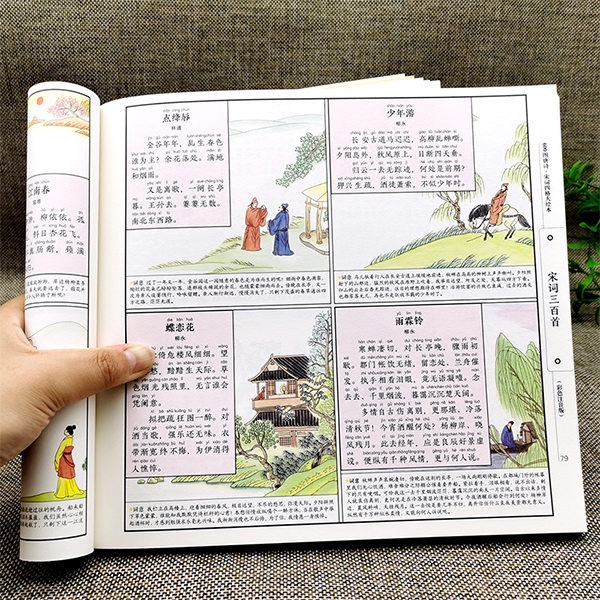 中国是一个诗的王国,唐代则是中国诗歌发展的全盛时期,涌现出了两千多位诗人,有着五万多首佳作。千百年来,人们吟诵唐诗、学写唐诗,民间也一直流传着“熟读唐诗三百首,不会作诗也会吟”的俗语,可见唐诗的影响之深。 唐诗的选本多达上百种,其中以清人蘅塘退士编选的《唐诗三百首》影响较大。但随着时代的发展,其中不少诗篇并不太符合当今少年儿童的阅读心理。更何况,如今是一个“读图”的时代。鉴于此,我们针对现今少年儿童的思维和心理特点,从流传甚广的唐诗中,精心选编了300首唐诗。这些诗篇篇幅短小,内容精粹易懂,如骆宾王的《咏鹅》、白居易的《赋得古原草送别》等。 词,原是隋唐之际兴起的配合音乐歌唱的歌词,又称曲子词、乐府、长短句等。到了宋代,词的内容更加丰富多彩,不仅描写细腻,而且意境雅致,成为宋代最有代表性的文学体裁。宋词数量颇丰,《全宋词》共收录了一千多位词人撰写的近两万首词作。 针对当今少年儿童的思维和心理特点,编者所收录的都是流传经久不衰的名篇佳作,篇幅大多短小精悍,易于成诵。书中许多名句常被后人用来抒发自己的感慨,如苏轼《水调歌头》“但愿人长久,千里共婵娟”、陆游《卜算子·咏梅》“零落成泥碾作尘,只有香如故”等。 为了让孩子们做到“无障碍阅读”,我们给每首诗、词都加注了标准的汉语拼音,每首诗、词均配有生动的精美彩图,与内容相得益彰。在编排上,我们遵循“大字号”的原则,便于孩子们进行阅读和背诵。