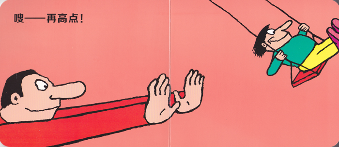 父亲在陪伴孩子游戏的过程中,装备齐全、着装专业、动作卖力。可以从很多对页中看出孩子在与父亲玩耍的过程中,全情投入,劲头十足。之所以可以调动起孩子这样的参与性,并非游戏多么有趣、设备多么高端,只是因为,父亲在认认真真地对待幼小的孩子,没有糊弄他,给予了足够的尊重。