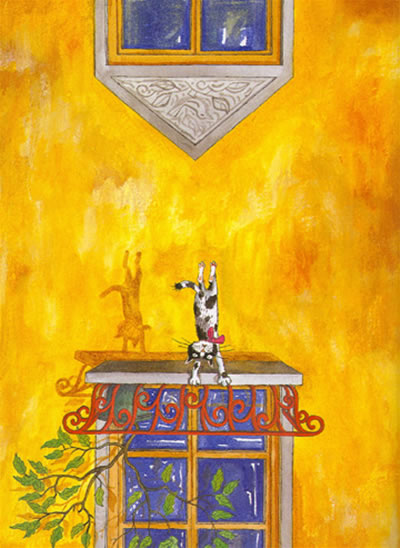 然后在幾米的作品里就不断的出现猫。有站在窗台上寂寞的猫的背影,有偷吃蛋糕的猫,有被生活凄惨的主人抱在怀里惊愕的猫……。