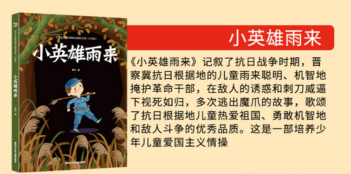 小英雄雨来 《小英雄雨来》记叙了抗日战争时期,晋 察冀抗日根据地的儿童雨来聪明、机智地掩护革命干部,在敌人的诱惑和刺刀威逼下视死如归,多次逃出魔爪的故事,歌颂了抗日根据地儿童热爱祖国、勇敢机智地和敌人斗争的优秀品质。这是一部培养少年儿童爱国主义情操